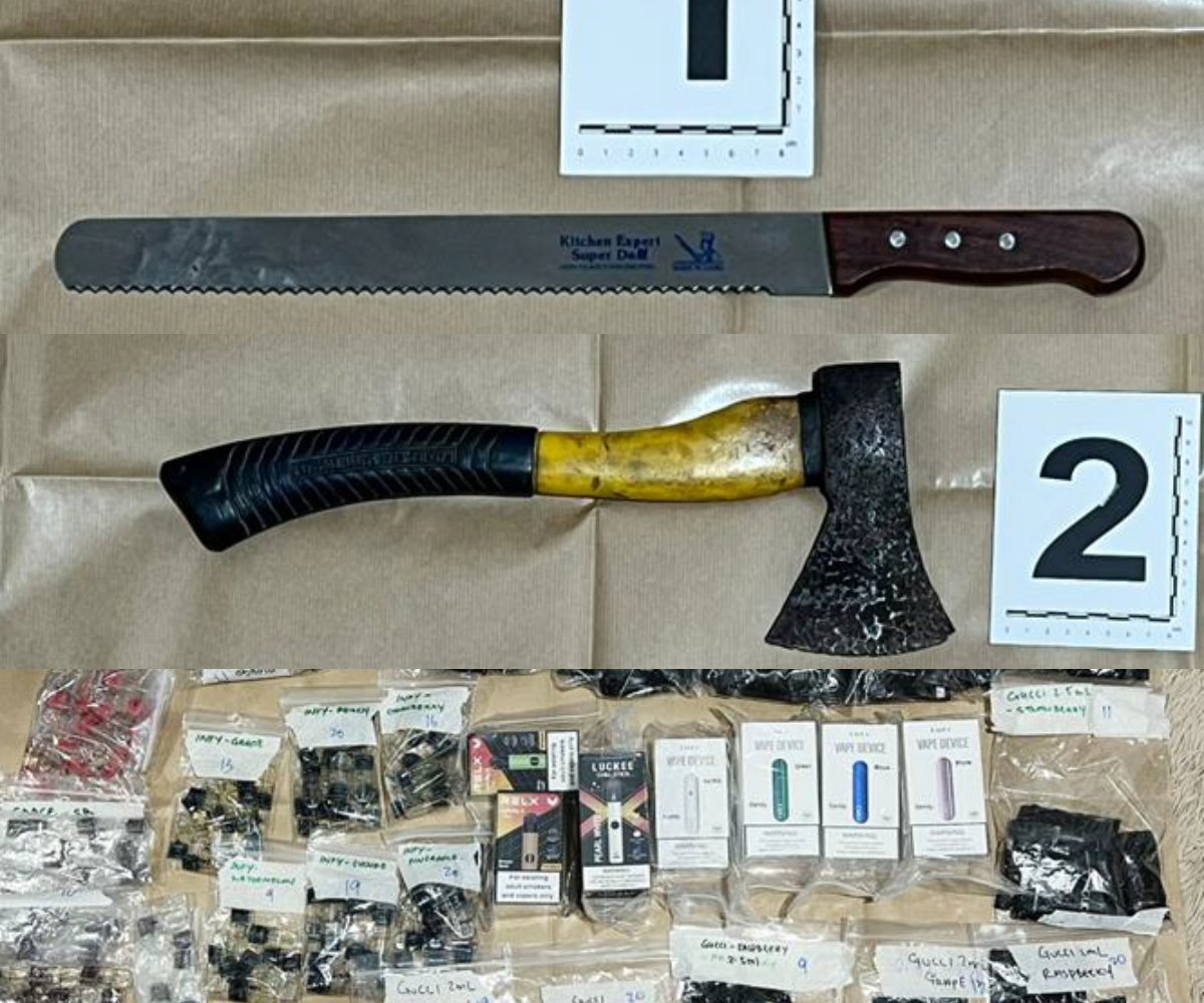 The assailant was also arrested for possession of offensive weapons. Two machetes, an axe and a baseball bat, along with three mobile phones, 14 e-vaporisers, 450 e-vaporiser components and over $3,000 in cash were seized as case exhibits.