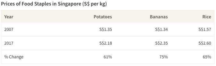 Food has also become more expensive in Singapore. Overall, the price of food has increased approximately 7 per cent faster than inflation over the past 10 years according to data from the Singapore Department of Statistics. For example, essentials such as rice, bananas and potatoes have become at least 60 per cent more expensive since 2007, compared to 37 per cent for general food price index.