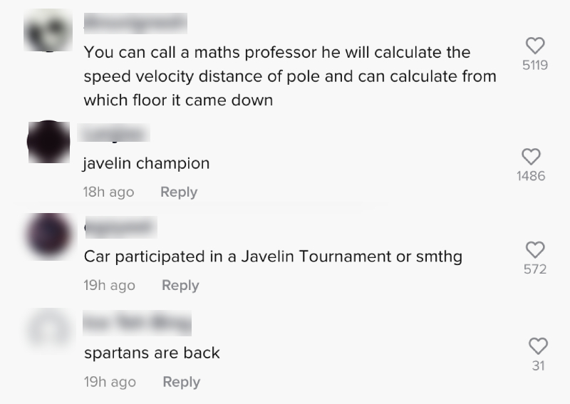 The clip showed how the fallen bamboo pole — with a blue laundry peg attached to it — had created a hole in the car's rear windscreen.