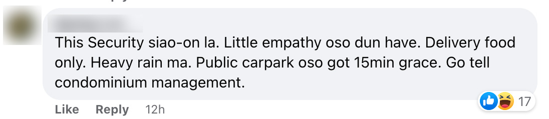"It was raining heavily and I parked at the carpark to [deliver] food," the rider said, adding that security personnel there then swooped in to clamp his motorbike two minutes later.