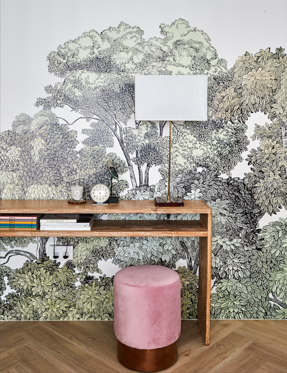 Anchored by the lush treetop wallpaper in their living room, the look is brought to life through soothing shades of green and wood accents throughout the house. The couple spent $40,000 on renovation.