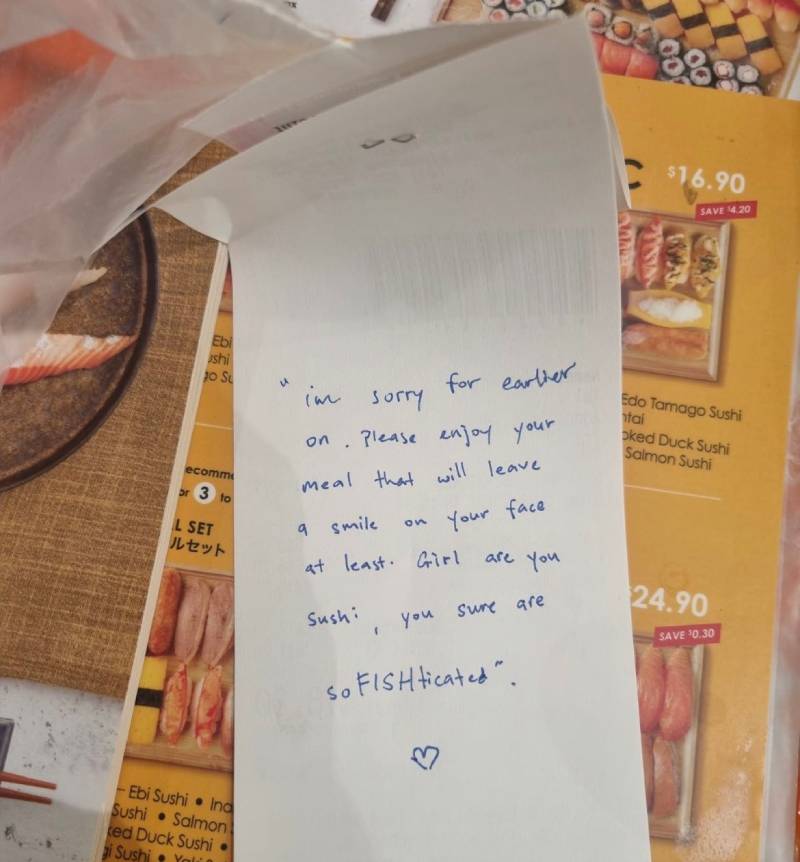 “I’m sorry for earlier on. Please enjoy your meal that will leave a smile on your face at least,” it read.