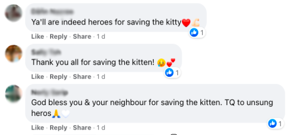 In the comments, netizens were full of praise for the rescuers, whom Lim acknowledged are his neighbours and are "the heroes who saved the kitty from certain drowning".