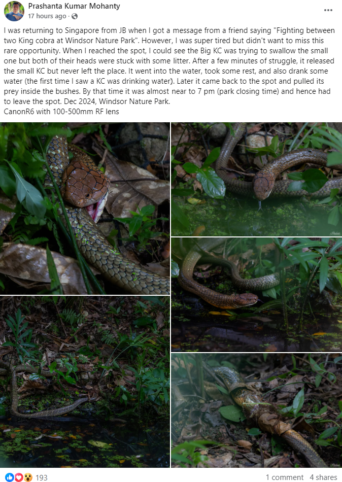 "I was alerted on Facebook of a sighting of a huge king cobra swimming in the stream at Windsor Nature Park. The king looked to be in hunting mode and I was hopeful it may linger around," wrote the 26-year-old doctor.