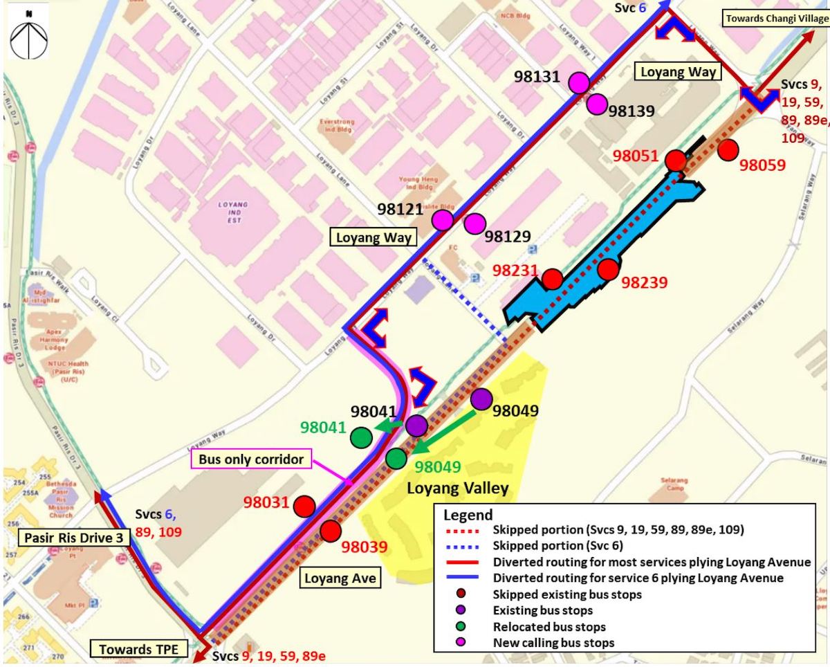 Six bus stops along Loyang Avenue will be removed and the seven bus services plying the affected stretch will be temporarily diverted to use Loyang Way via a new bus-only corridor adjacent to Loyang Avenue, which has been constructed to support the diversion.