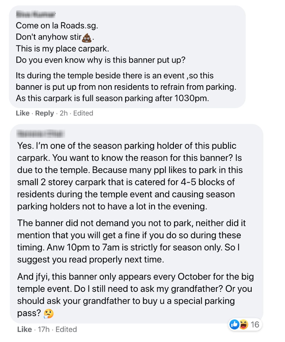 So when one netizen took to Facebook yesterday (Oct 29) to share a photo of a banner requesting for visitors to "refrain from parking" at an HDB carpark in Jalan Kayu, things got understandably heated.
