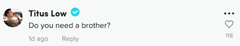 Fellow content creator Titus Low also slid into her TikTok comments section and asked Alkaff if she needed a brother.