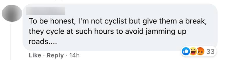 Although not many agreed with the cyclists' road behaviour, a couple of netizens chose to cut them some slack. They commended the cyclists' efforts to go about their group activity at odd hours in order to avoid obstructing traffic.