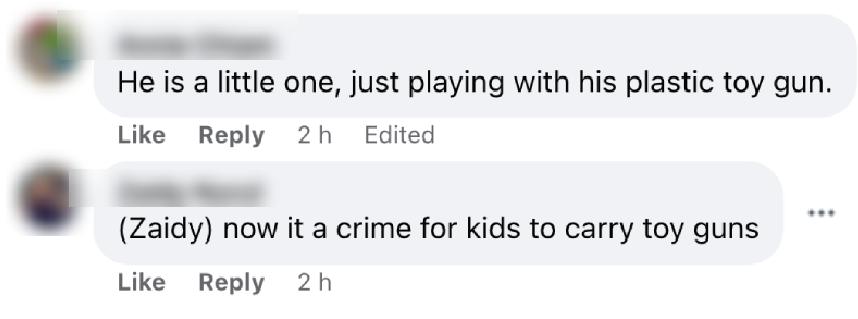 But several netizens played down the incident, arguing that the boy was just "playing with a toy plastic gun".