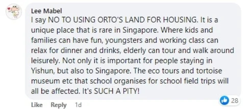 Facebook user Lee Mabel disapproved of the plan for Orto to make way for housing, highlighting that the park is a rare place in Singapore for all ages to have fun.