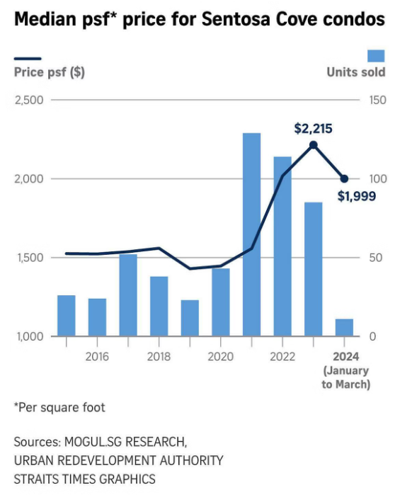 But Mak also cautioned potential buyers who are hoping to make capital gains that Sentosa is less accessible than homes on the mainland, and it might take an extraordinary event like the pandemic or an easing of property cooling measures for prices in Sentosa Cove to rise again.