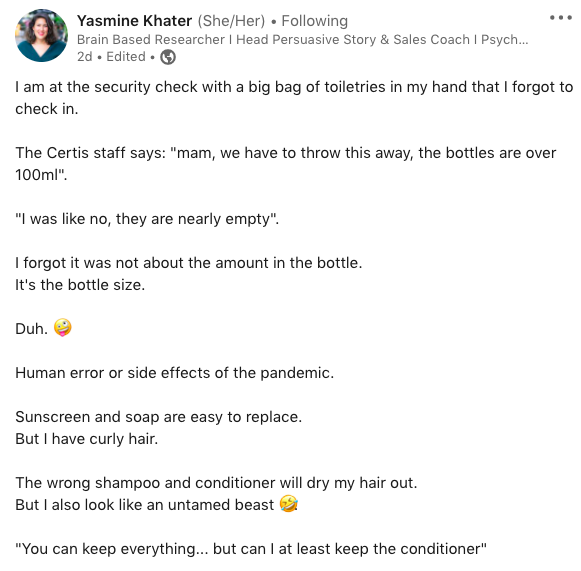 The 37-year-old Singaporean CEO of a sales consultancy described how she'd forgotten to check in her bag of toiletries for the trip.