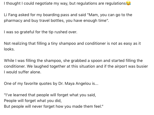 "While I was filling the shampoo, she grabbed a spoon and started filling the conditioner. We laughed together at this situation and if the airport was busier I would suffer alone," Khater wrote.