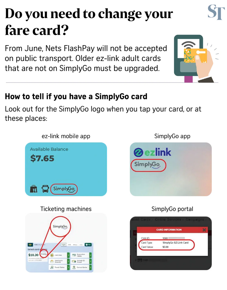 Passengers have until Aug 31 to upgrade their older ez-link cards at SimplyGo ticket offices, ticketing service centres and ticketing machines at rail stations and bus interchanges, LTA announced on Jan 9.
