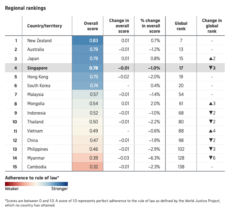 SINGAPORE - Singapore has slipped three places in a global ranking of rule of law and fallen outside the top three spots in the region for the first time since 2015.