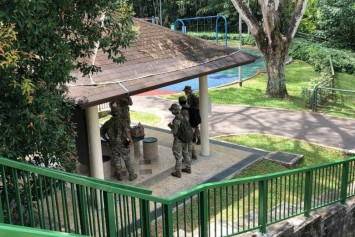 When The Straits Times arrived at the scene on Saturday afternoon, officers from the Gurkha contingent were spotted walking inside the canal, a segment of which was littered with what appeared to be cushions, and combing the forested area behind the playground.