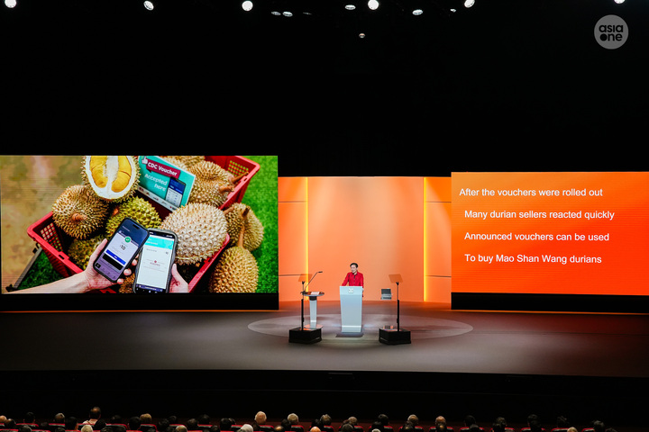 "I know many people love durians. I like them too. However, after satisfying your durian cravings, please don't forget to save some vouchers for your daily essentials," he said, half in jest, much to the laughter from the audience.