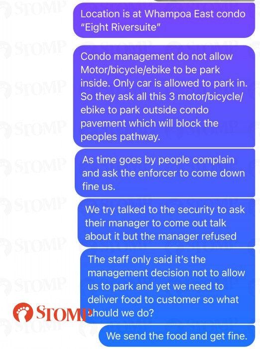 The Stomp contributor also shared a screenshot of messages about the incident, which said: "Condo management does not allow motor/bicycle/e-bike to be parked inside. Only cars are allowed to park inside. So they asked all these motor/bicycle/e-bike to park outside the condo on the pavement which will block the people's pathway.