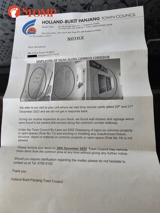 She also shared a photo of the notice from the Holland-Bukit Panjang Town Council dated Dec 21.