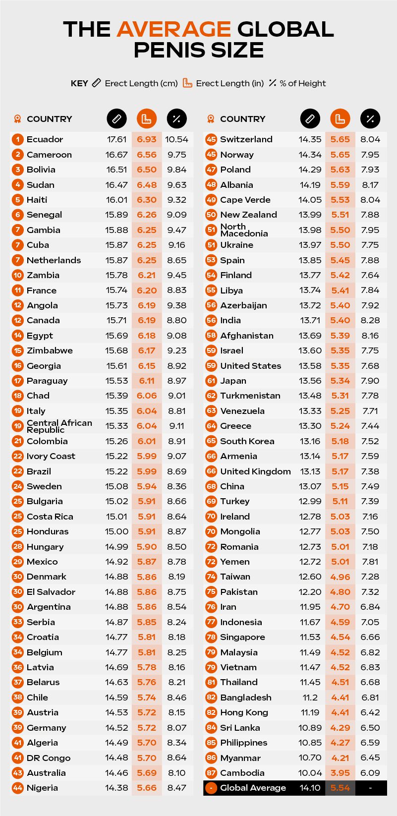 That's around 6cm shorter than the country that top the league table - Ecuador, whose men pack an average 17.61 cm under their trousers.