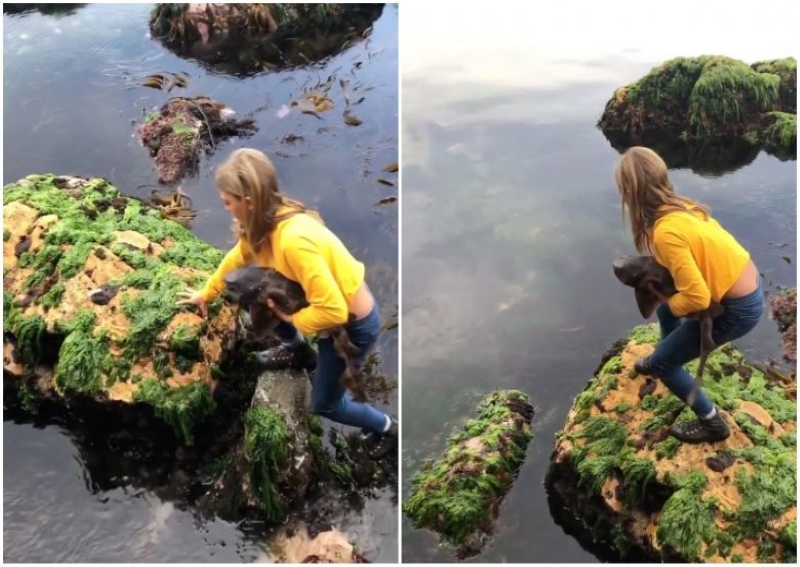 "Just be careful because it's super slippery," Abby could be heard cautioning in the video just before Billie reaches the water's edge and places the shark into the sea.