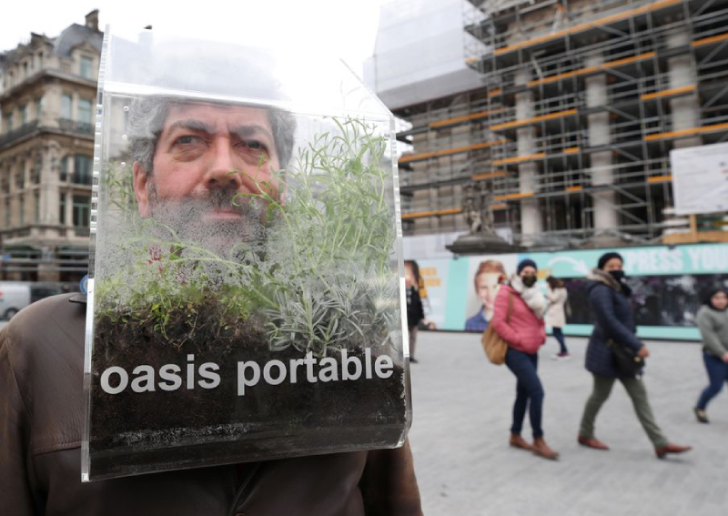 Alain Verschueren, a Belgian artist and social worker, has been strolling through the capital Brussels wearing a "portable oasis" - a plexiglass mini-greenhouse which rests on his shoulders, cocooning him in a bubble of air purified by the aromatic plants inside.