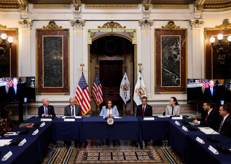 Vice President Kamala Harris, who has travelled to six different states to convene state legislators about protecting reproductive health care in recent weeks, joined Biden for the meeting and called the abortion issue a "healthcare crisis in America."