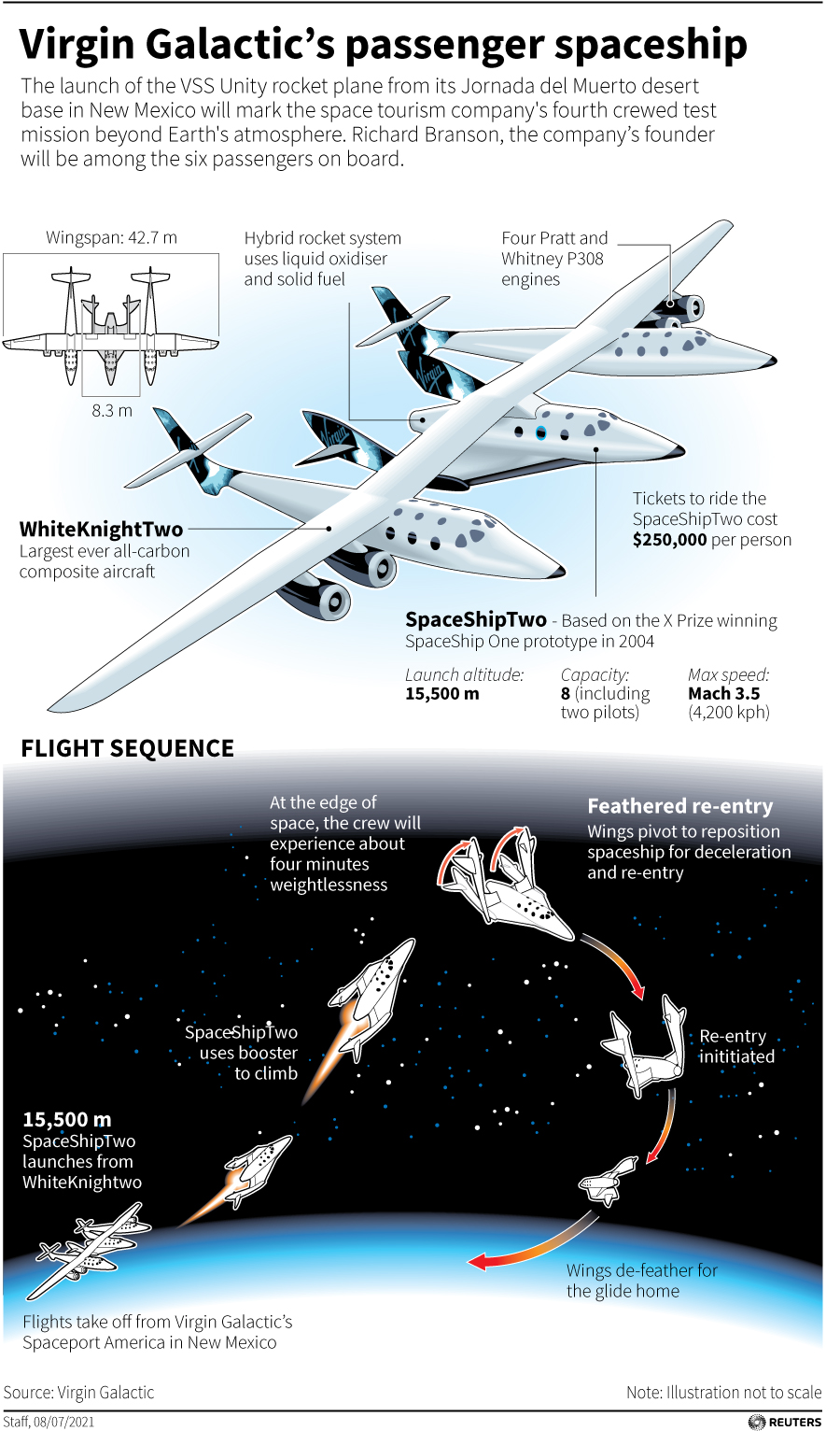 TRUTH OR CONSEQUENCES, N.M - British billionaire Richard Branson on Sunday (July 11) soared more than 50 miles above the New Mexico desert aboard his Virgin Galactic rocket plane and safely returned in the vehicle's first fully crewed test flight to space, a symbolic milestone for a venture he started 17 years ago.