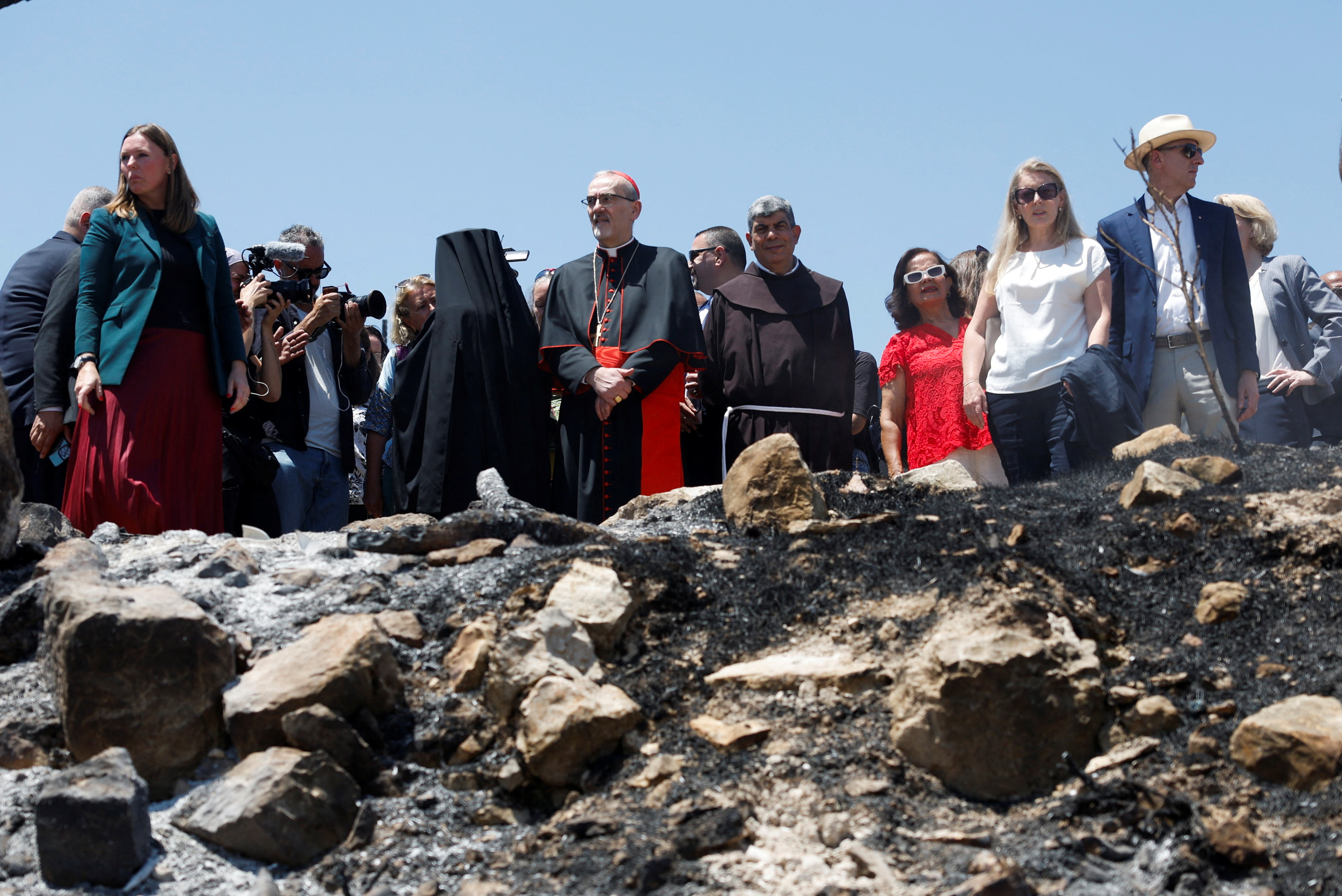 The Greek Orthodox Patriarch of Jerusalem, Theophilos III — visiting the Christian town of Taybeh with other Jerusalem-based clerics - said settlers had started a fire near a cemetery and a 5th century church there last week.