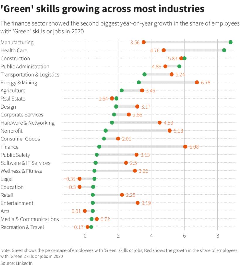 LinkedIn data shared with Reuters shows a steady increase in the number of finance jobs listed as requiring at least one "green skill", such as pollution prevention or ecosystem management, particularly in the United States.