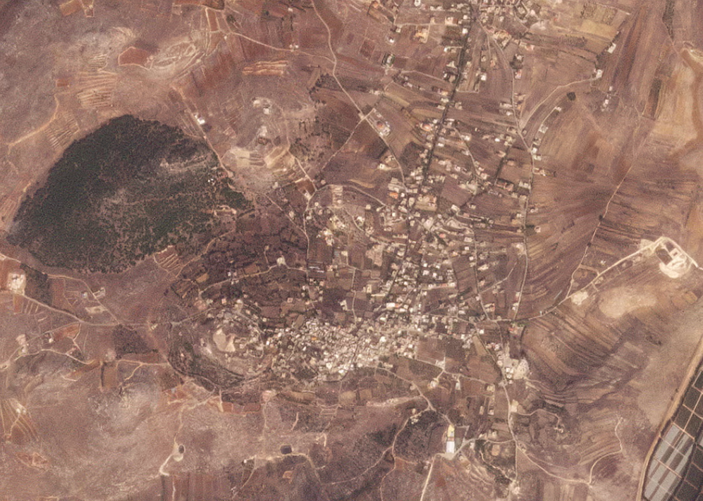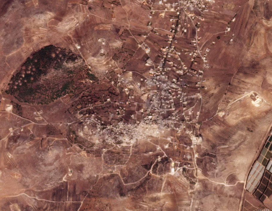 The most recent images of Kfarkela showed a string of white splotches along a main road leading into a town. Imagery taken last year showed the same road lined with houses and green vegetation, indicating the houses had been pulverised.