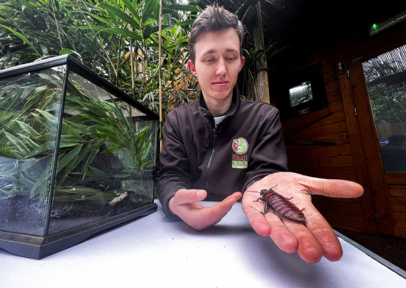 Henry Weedon, Operations Manager at Hemsley Conservation Centre poses with a cockroach, in Fairseat, Kent, Britain, on Feb 10, 2022.