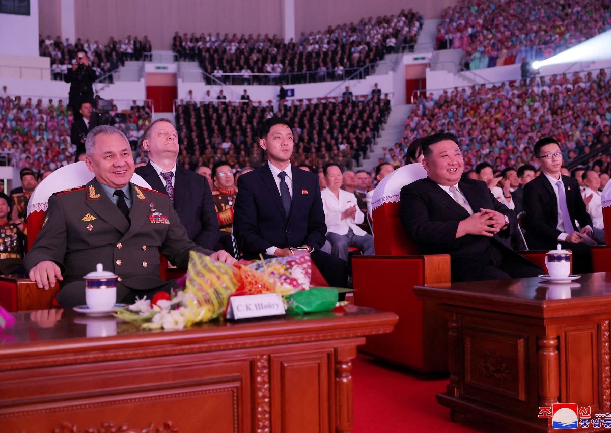 State media photographs showed Kim at a large flashy performance flanked by Shoigu and Li, with a backdrop that included a slogan used by the Chinese army during the Korean War vowing to "resist US aggressors".