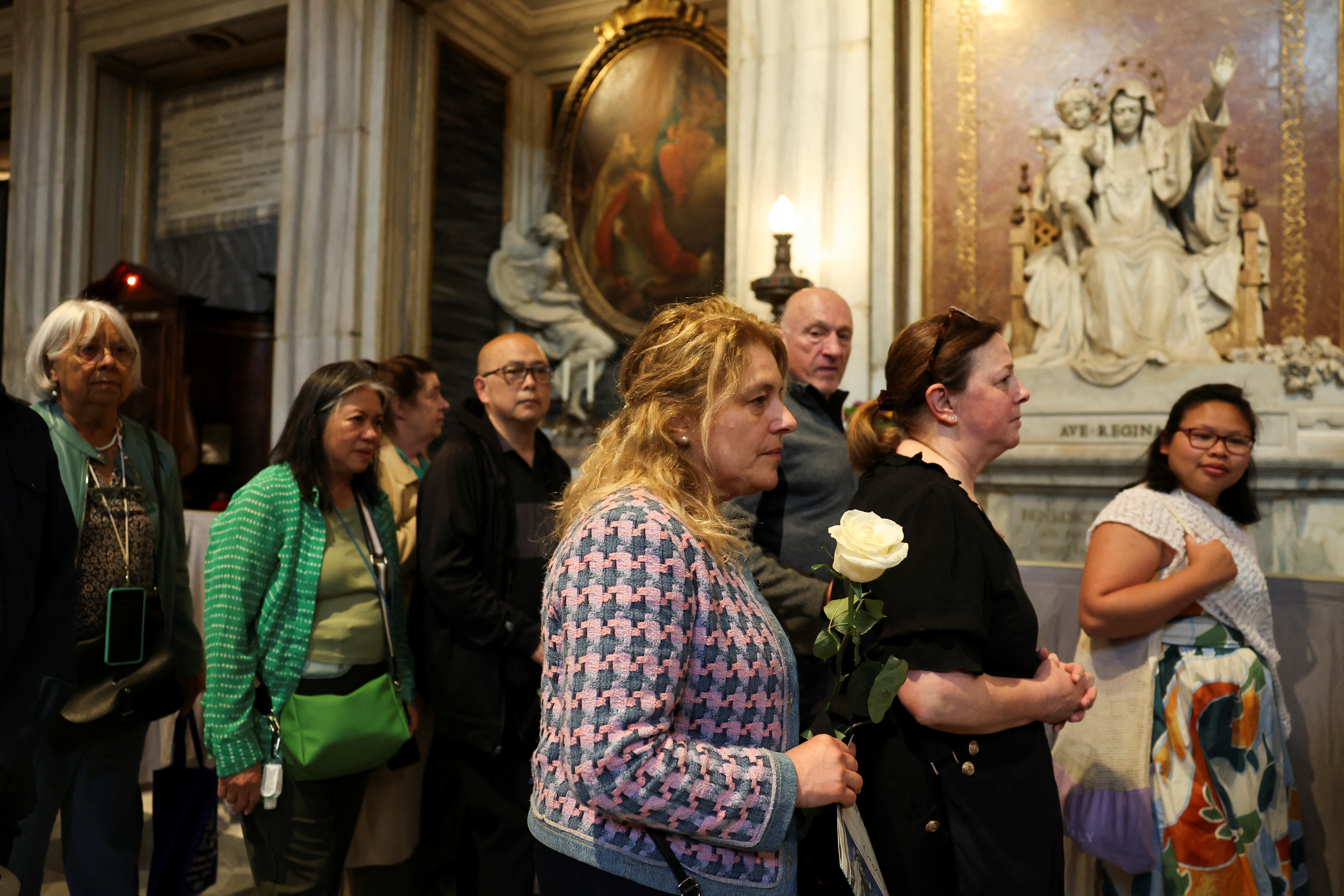 A venerated Byzantine icon of Mary is housed in the Pauline chapel near the tomb. A vase of golden roses, donated by Francis in 2023, sits among candlesticks under the icon. He last visited the chapel carrying a bunch of white roses on April 12.