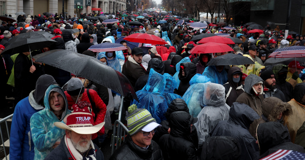 Ahead of the event, Trump's fans, many dressed in the campaign's trademark red jackets and MAGA hats, waited in a cold, driving rain along several downtown Washington blocks, some chanting "USA! USA!"
